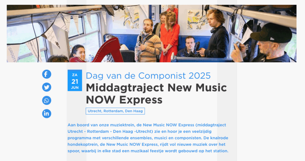 Dag van de Componist 21 juni 2025: tijdens het middagtraject Utrecht-Rotterdam-Den Haag-Utrecht speelt Emlyn Stam in de rode Hondekoptrein ’54 tweemaal mijn compositie ‘Twelve’ voor altviool solo, om 17.30 en om 17.55 u (zie blokkenschema). De rode Hondekop verwijst naar de Mat ’64 treinstellen van de NS, die vanwege hun kenmerkende neus de bijnaam “Hondekop” … Meer lezen over ‘Twelve’ in de Rode Hondekoptrein